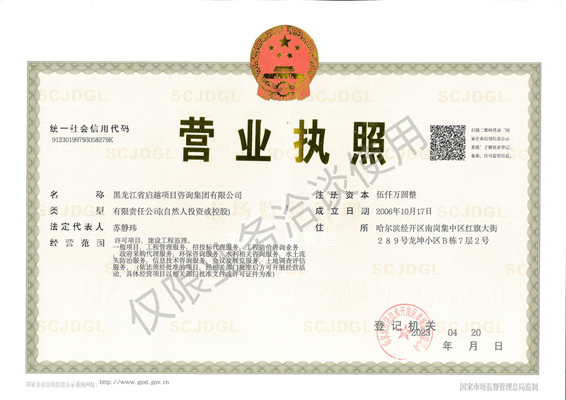 黑龍江省啟越項目咨詢集團有限公司,成立于2006年10月17日,具有中華人民共和國住房和城鄉建設部頒發的工程招標代理機構甲級資質、工程造價咨詢企業甲級資質;黑龍江省住房和城鄉建設廳頒發的房屋建筑工程監理資質及市政公用工程監理資質;黑龍江省司法廳頒布的司法鑒定許可證;中國政府采購網登記注冊的政府采購代理機構。我公司是專業從事工程類招標代理服務、政府采購項目類招標代理服務、工程造價咨詢服務、工程造價司法鑒定服務、工程監理服務及建設項目全過程跟蹤管理的工程技術服務咨詢企業。